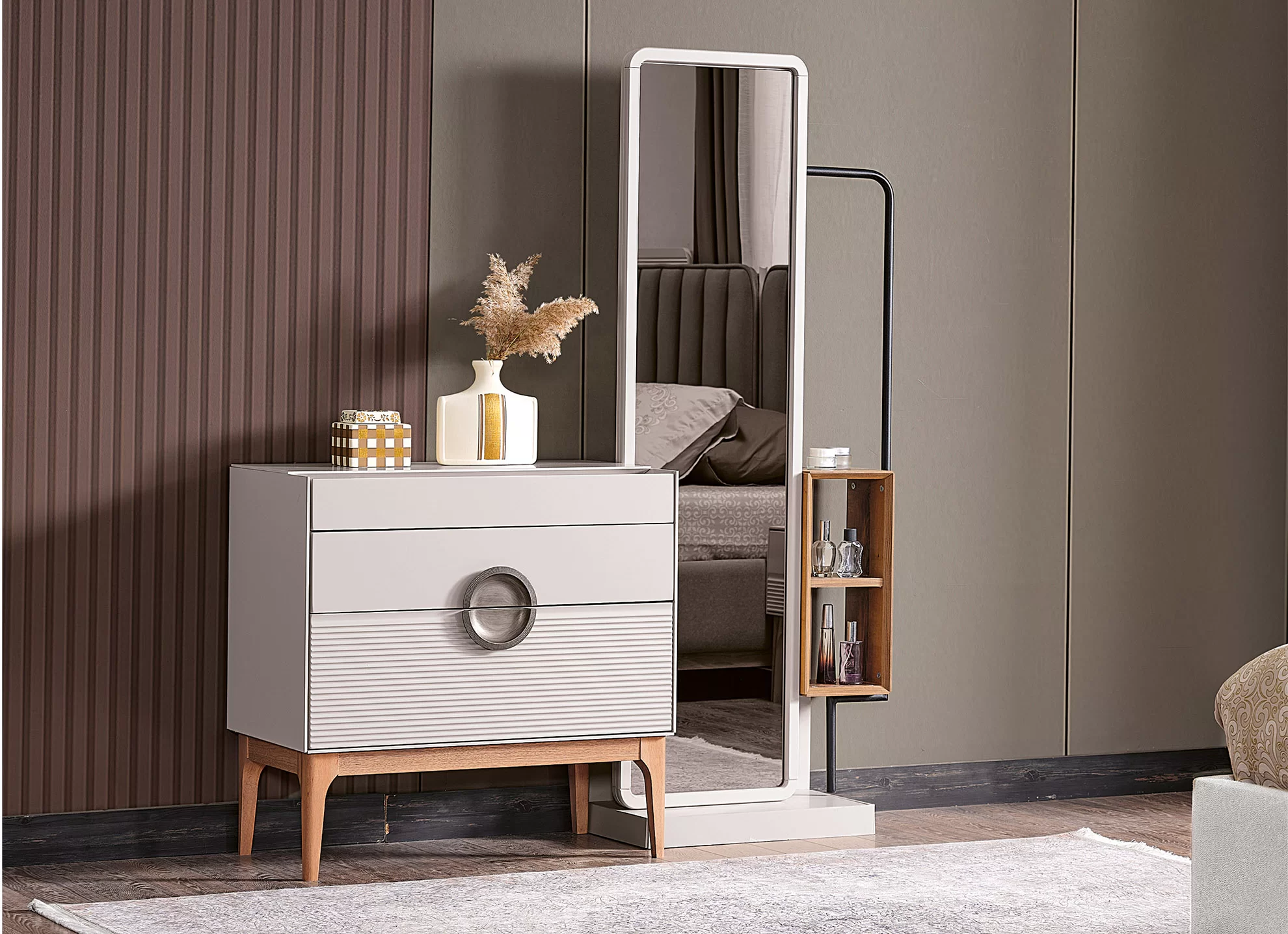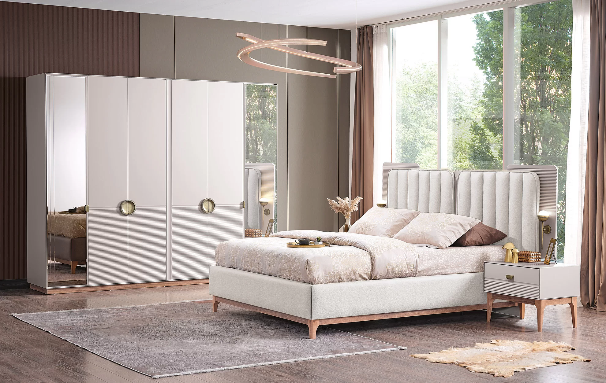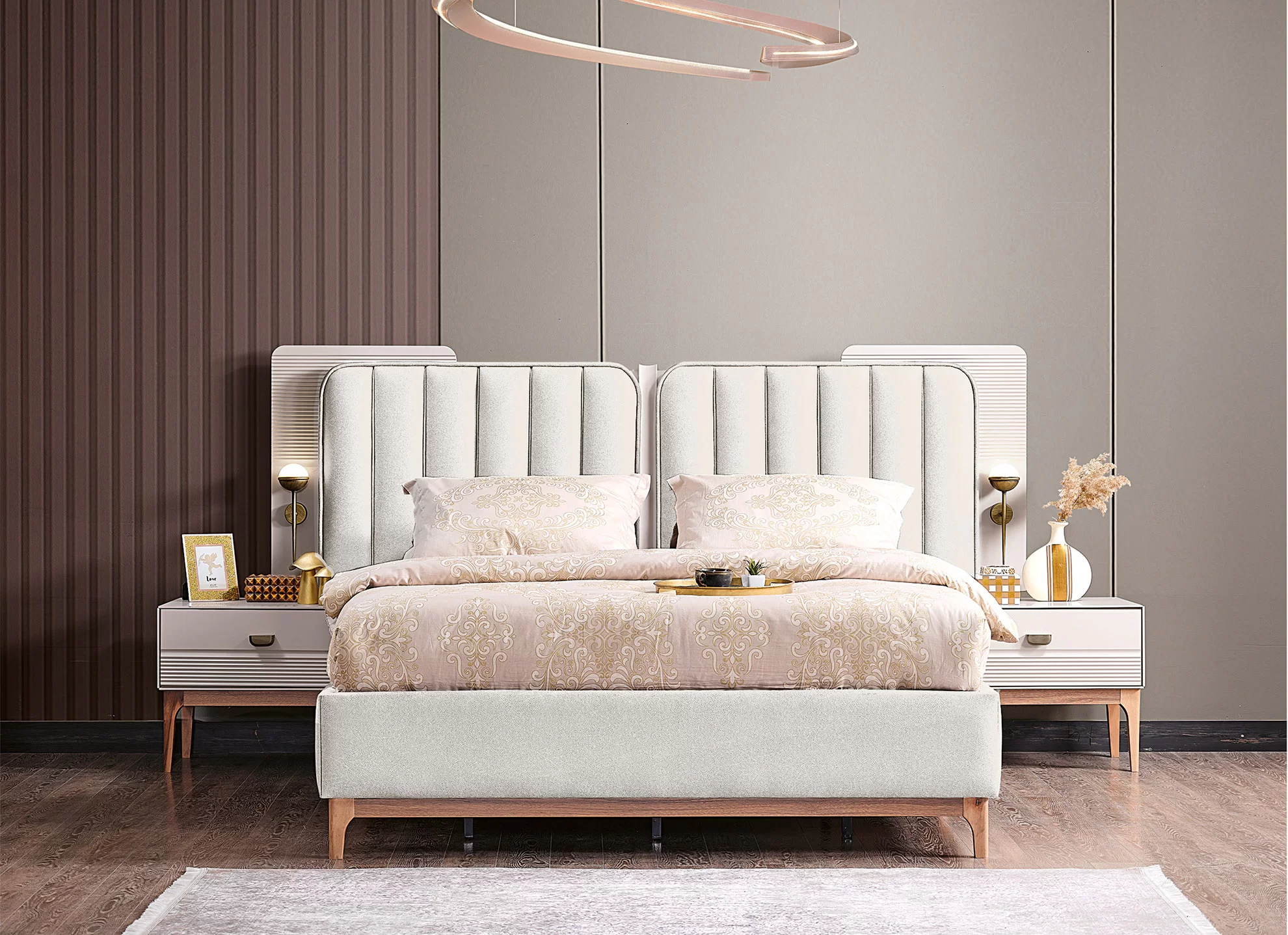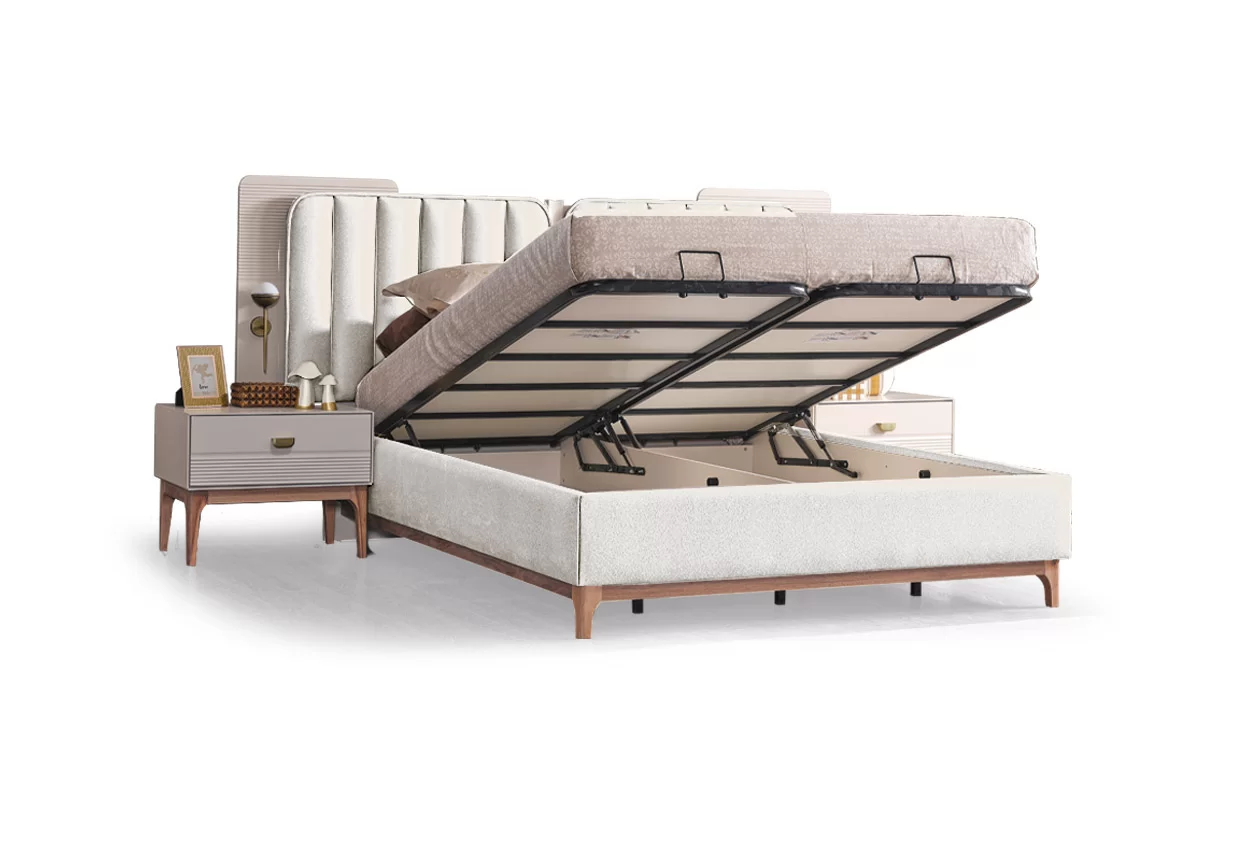 Bu yatak odası takımının en önemli parçası, hem konfor hem de modern bir estetik sağlayan şık ve sağlam bir platform yataktır. Net çizgileri, minimalist ve sofistike bir atmosfere katkıda bulunuyor.