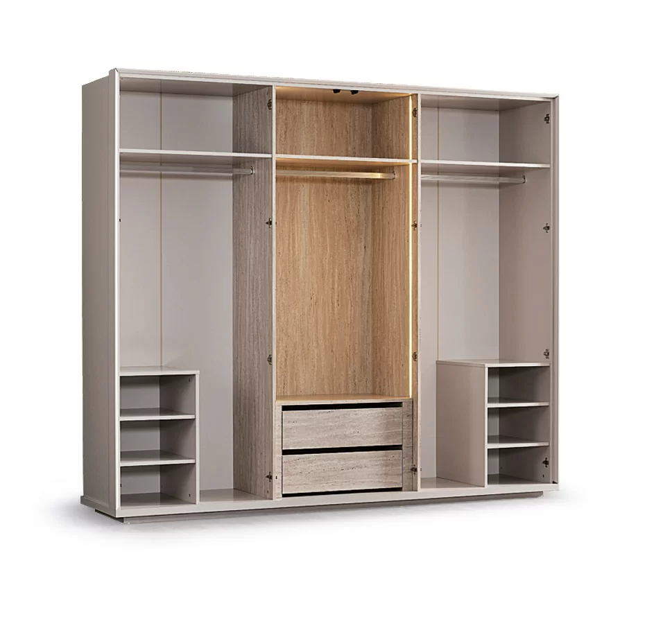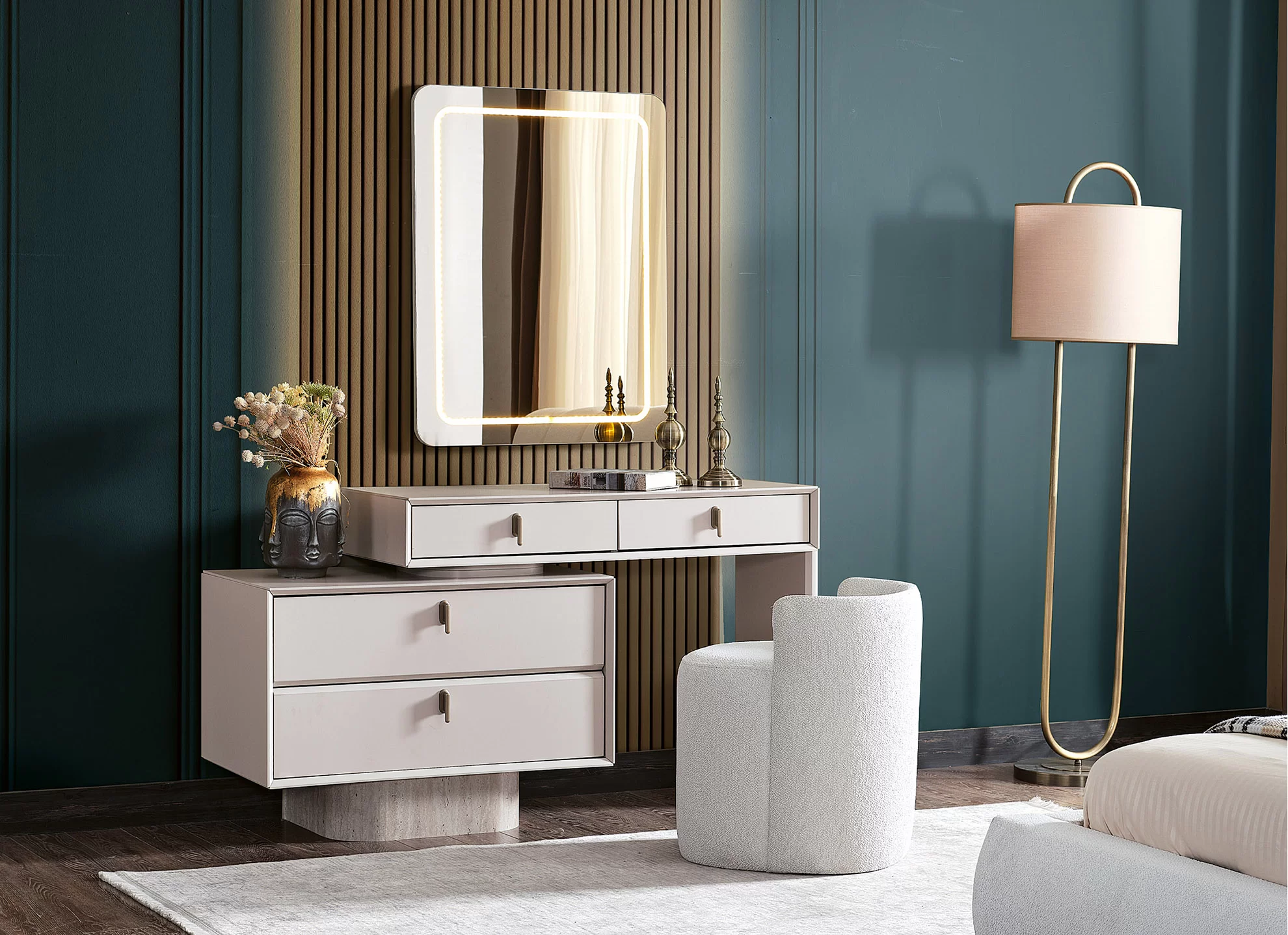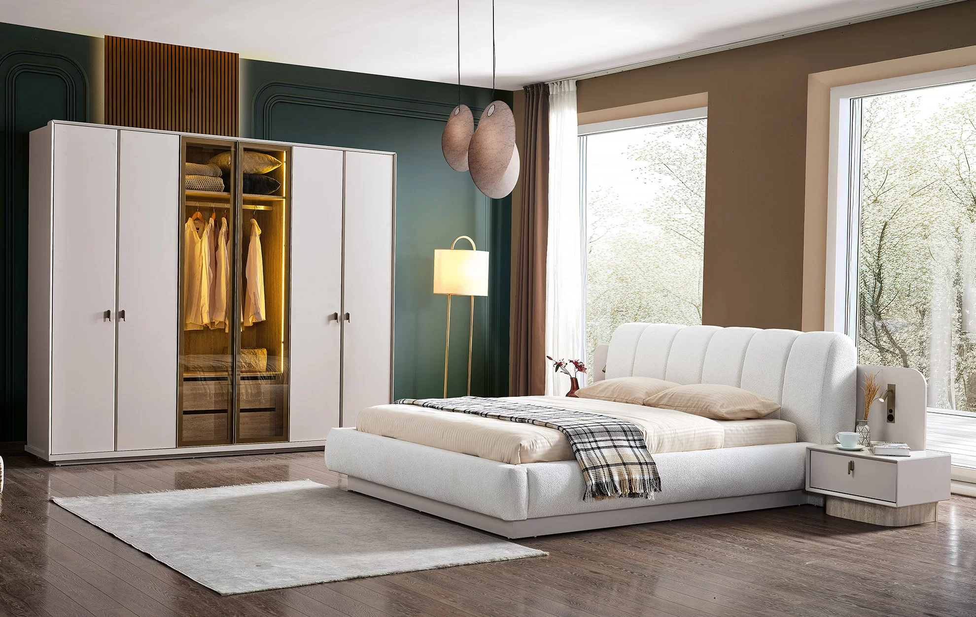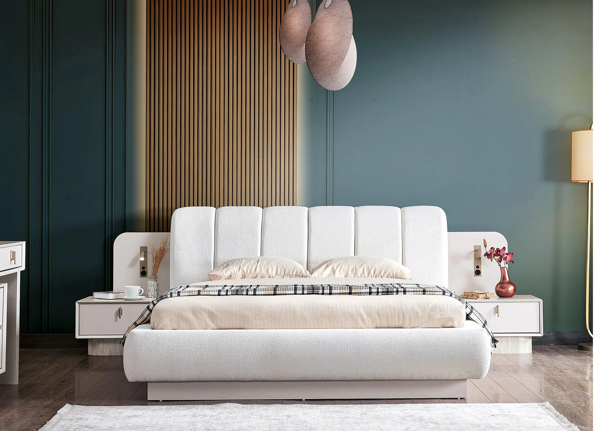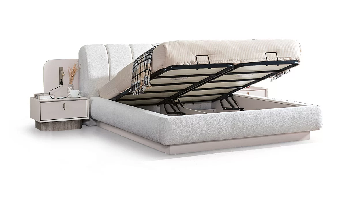 Modern tasarımın konforla buluştuğu bu yatak odası takımı, bej rengi kumaş kaplamalı kavisli başlığı ve minimalist yatak platformuyla odanıza huzur dolu bir merkez oluşturur.